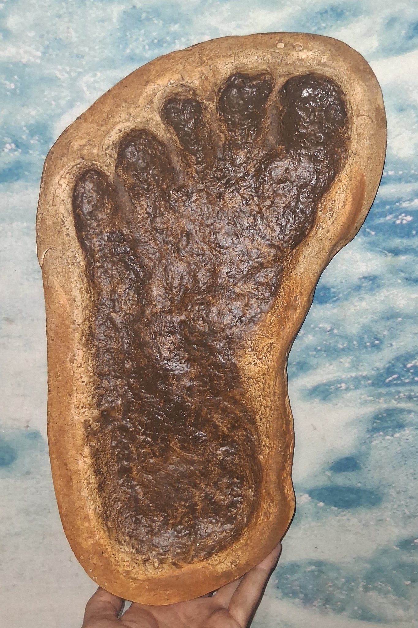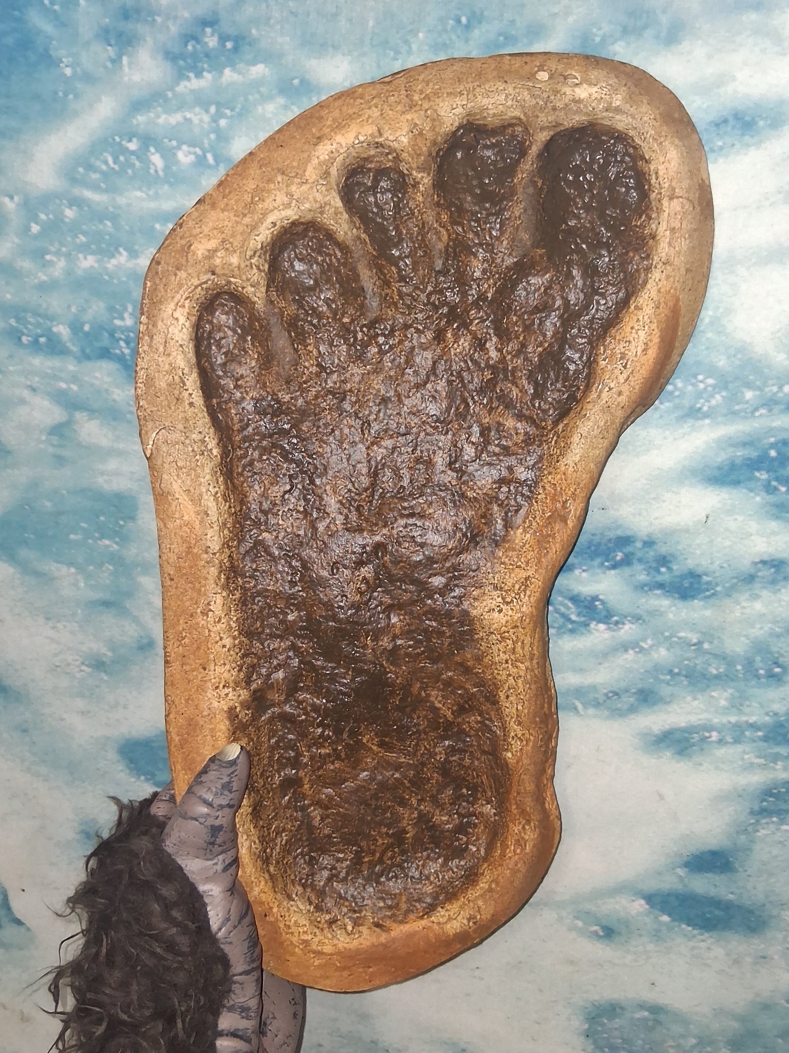 This is an authentic replica of a Sasquatch footprint discovered in southern Washington State. It is believed to be the left foot of an adult male, estimated to weigh around 800 pounds.